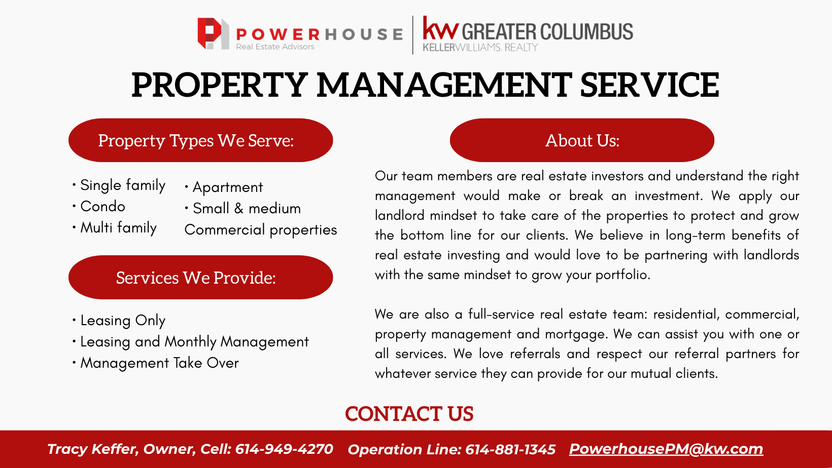 Our team members are landlords ourselves, so we understand a landlord's concerns: finding qualified tenants through our thorough screening and background check process, understanding cash flow concepts and how proper management can affect both short-term and long-term cash flow. We manage properties in a way that gives our owners the confidence to acquire more properties for their portfolio and build generational wealth. We believe in partnership throughout this long journey.